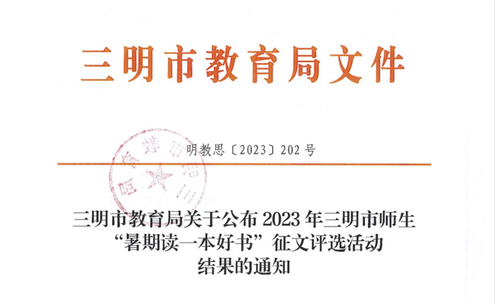 近日,三明市教育局公布2023年三明市师生“暑期读一本好书”征文评选结果,由我校语文教研组沈传文老师负责审阅选送的两篇学生作品获高中组二等奖。获奖人为张晨妍(2...…