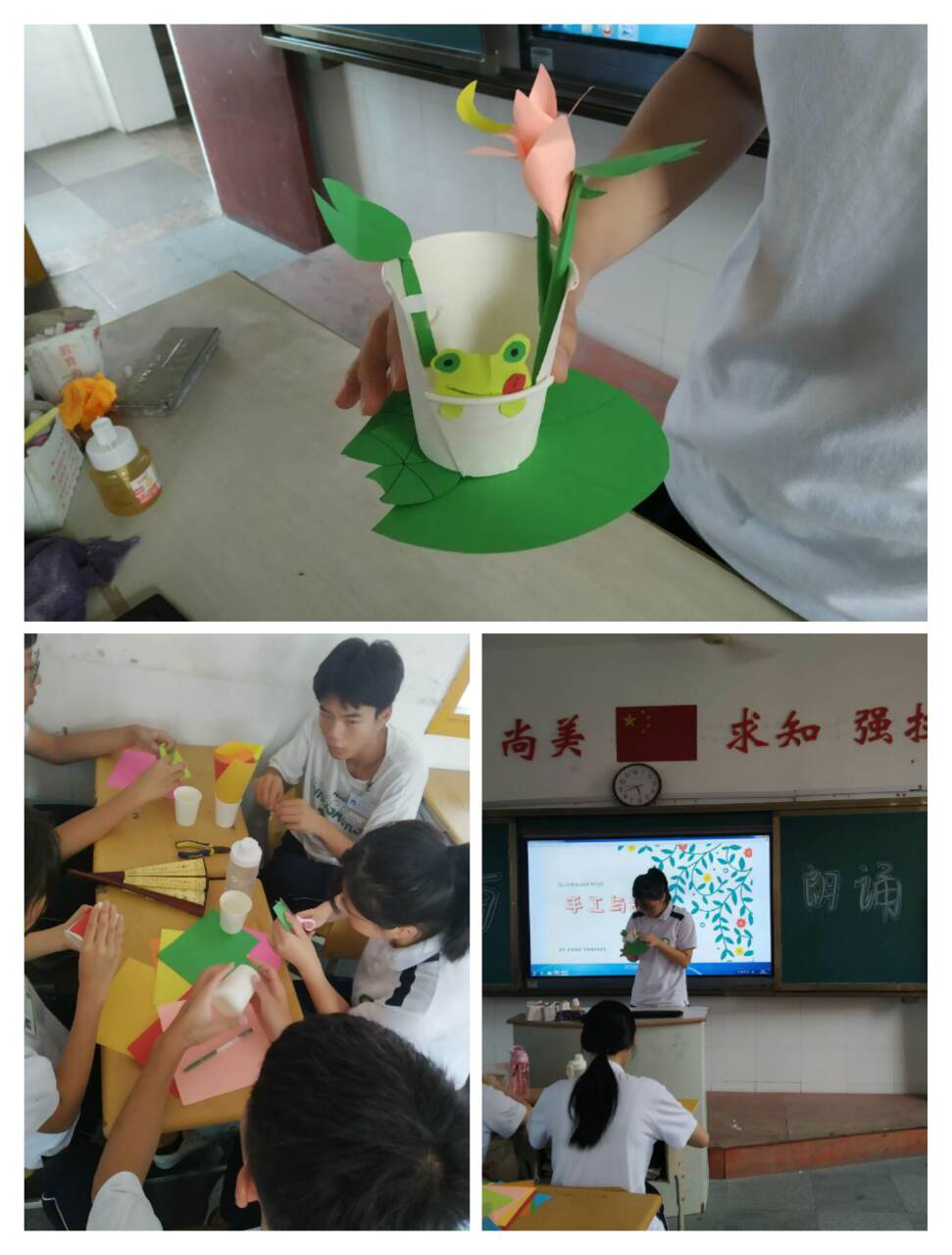 第一组由巫嘉怡同学组织,作品主题为“荷塘月色”。他们利用材料做出最具夏天特色的荷塘,荷塘上开着荷花,青蛙在荷塘中呱呱叫。加上深情的诗文朗诵,让我们感受到习习凉风下,蛙声一片的夏夜之美。