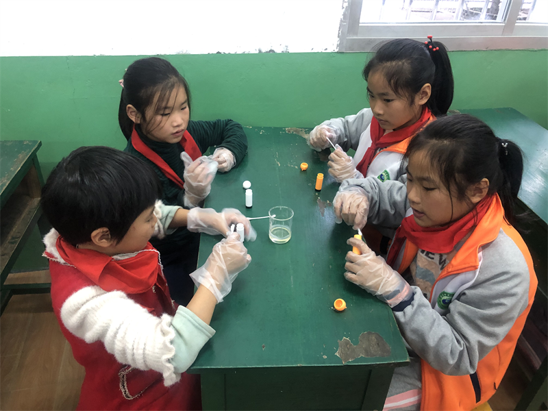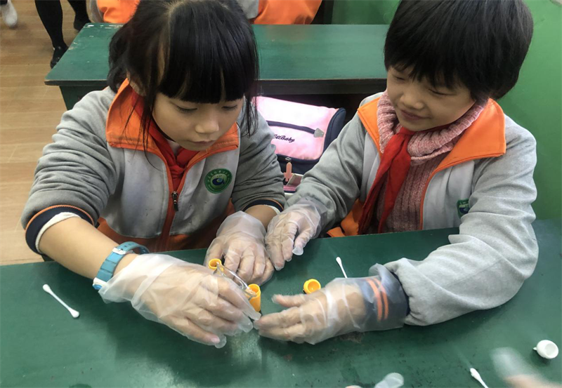 在美术教室里,同学们剪、粘、描、涂,一个个生趣盎然、色彩斑斓的“鸟巢”在他们手中诞生了。在另一个教室,同学们戴上一次性手套,以山茶油为主原料,通过配比、调制、塑形,制作了一支支安全又美丽的唇膏。