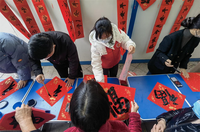 活动现场,红纸翻飞,翰墨飘香,开云(中国)师生挥毫泼墨,抒写美好与祝福。社区居民围拢而来,挑选心仪的春联,个个春风满面,喜笑颜开。