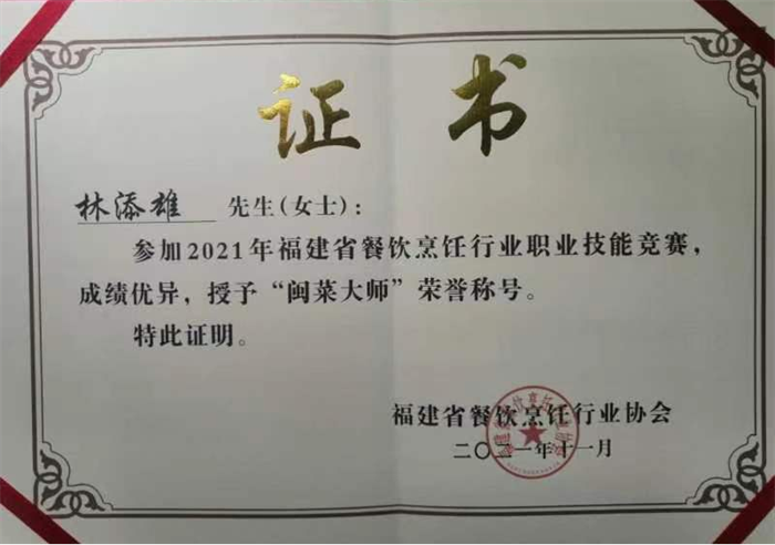 林添雄三明市农业学校烹饪专业教师,中共党员,32343部队退伍兵,中国烹饪协会会员。三明市技能大师工作室领衔人、福建省技能大师工作室领衔人、中式烹调高级技师、高级中式面点师、中式烹调高级考评员、中式面点考评员。近五年来,林添雄老师荣获福建“闽菜大师”、第二届“沙县工匠"、2021年度“三明工匠”、2022年度福建省“百姓学习之星”。