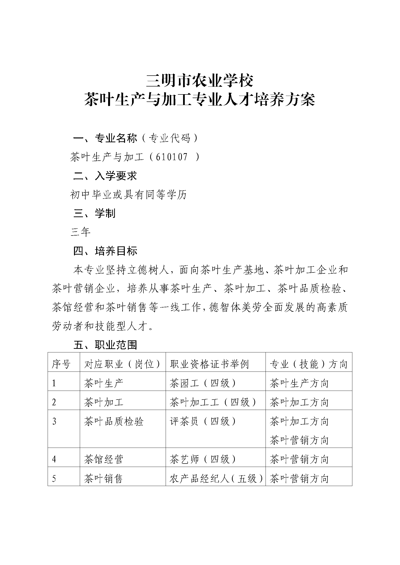 三明市农业学校茶叶生产与加工专业人才培养方案(2023)