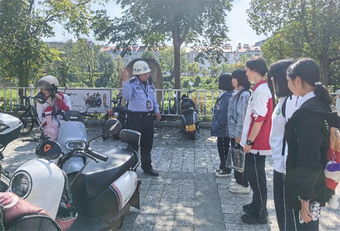 三明市农业学校法治副校长张诗汉在疏导指挥的同时,化身为交通安全宣传员,用通俗易懂的语言向学生讲解出行安全、“一盔一带”等交通安全知识和相关交通安全法规,有效提升了学生们交通安全避险能力和安全出行文明意识。