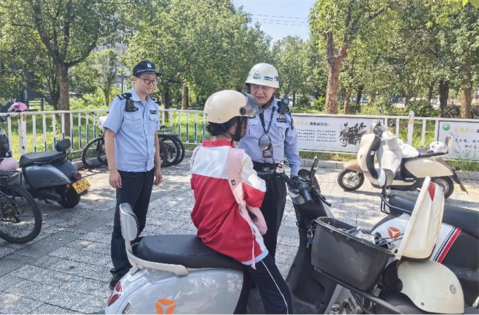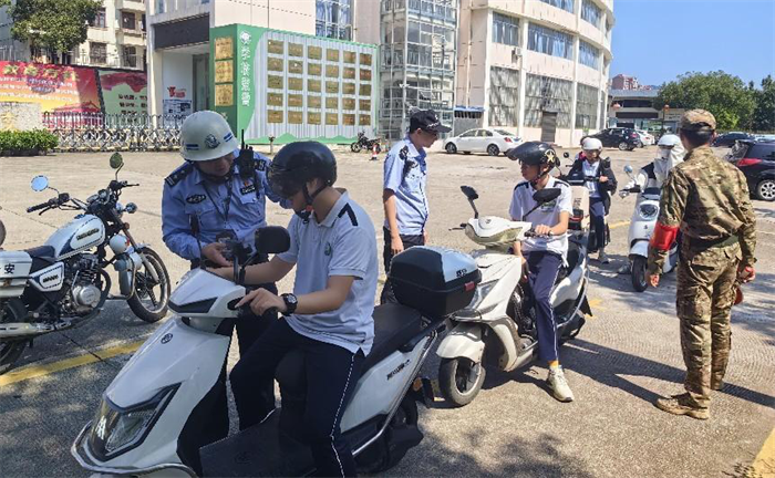 在护学中,全员智慧德育值周护学岗老师、德育教官与区公安民警联合督查学生不戴安全头盔、违规载人、违规驾驶超标电动车等交通违法行为。
