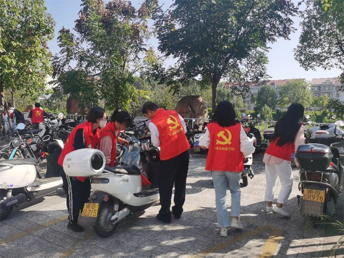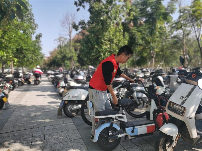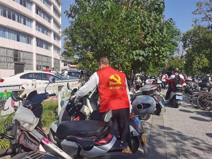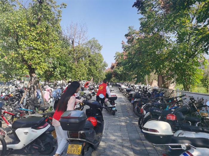在10月26日的党支部第三次主题教育学习研讨上,党员干部们提出,受近年学校通学生人数增加,停车棚车辆停放不规范等因素影响,师生停车不便现象凸显,亟待解决。10月30日起,党支部迅速行动,通过座谈会、现场考察等方式进行了详细的调研,并根据调研结果制定志愿活动方案,在校门口、车棚以设置服务点,安排党员志愿者在停车密集的时间点值班,引导师生规范停车,并宣传文明停车的理念。在党员志愿者的引导下,同学们自觉将非机动车停放到规范区域,为师生留出优美整洁的通道。