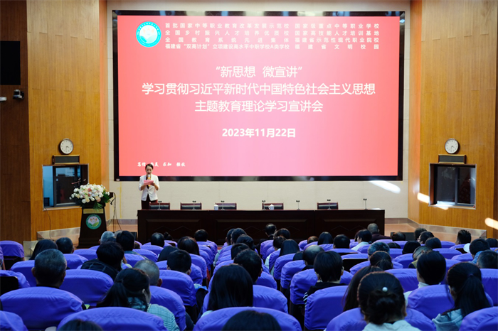 为深入开展学习贯彻习近平新时代中国特色社会主义思想主题教育, 11月22日下午,三明市农业学校在学术报告厅开展学习贯彻习近平新时代中国特色社会主义思想主题教育理论学习宣讲会,全体教职员工到现场聆听宣讲,全体学生在班级利用班班通观看宣讲。