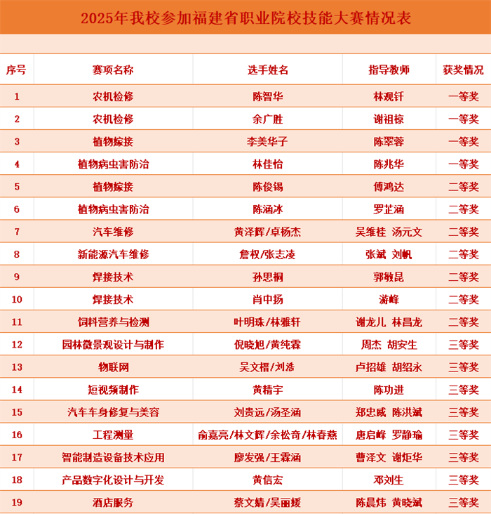 在2025年福建省职业院校技能大赛(中职组)中,我校参赛选手凭借扎实的专业功底和精湛的技能,荣获一等奖4项、二等奖7项、三等奖8项,刷新了我校参赛历史记录。此次佳绩生动诠释了我校教育教学改革的成果,为推动人才培养质量提升注入了强劲动能。